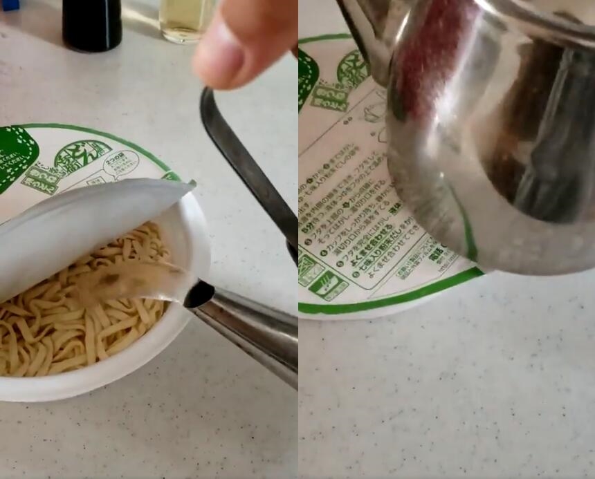 ▼日本網友@Kobayan_honaka在推特上分享了一段影片,表示「找到了固定泡麵蓋的方法」,從影片中可以看到,原PO將熱水倒入泡麵碗後,用熱水壺按壓泡麵碗的邊緣,紙蓋就密實地貼合在了泡麵碗上,不會再翹起來了。