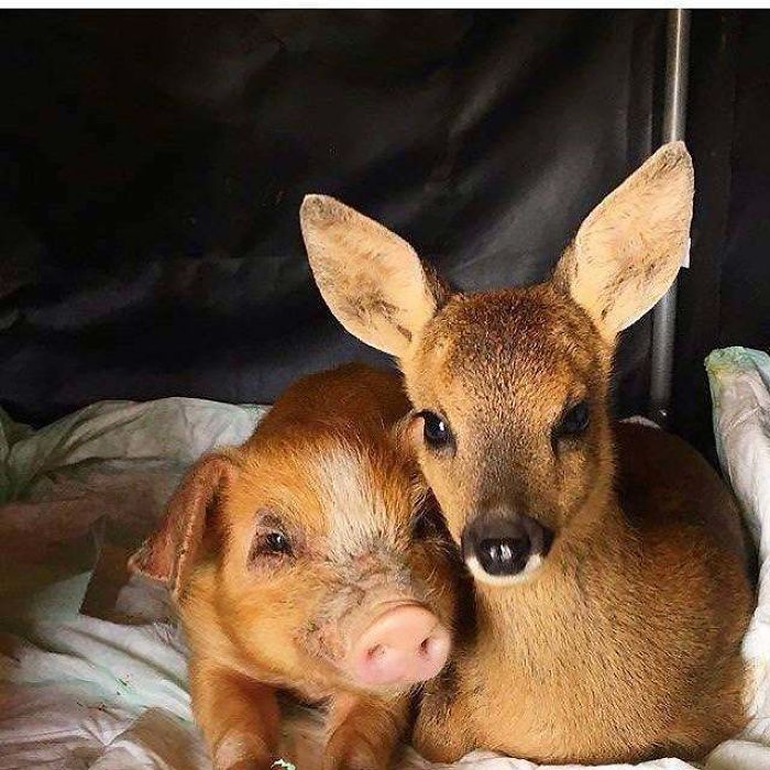 ▼19.豬豬和小鹿依偎在一起,超可愛!