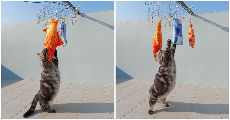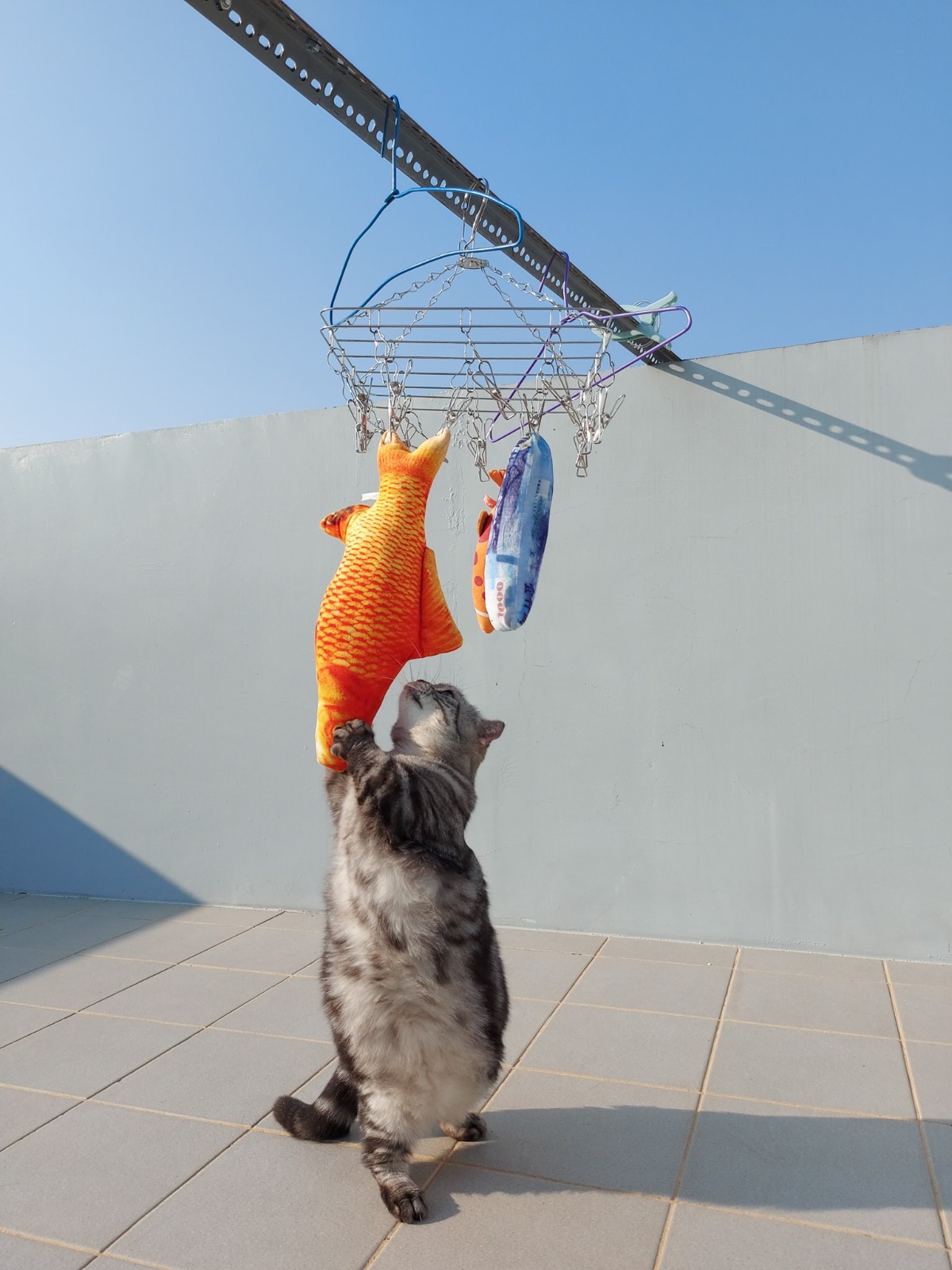 當時飼主將貓咪的玩具都晾在較低處的曬衣夾上,儘管寶妹手腳都短短的,但還是奮力站起來想抓住寶貝們,而馬麻捕捉到的照片就好像是毛孩自己在晾玩具一樣,還不小心露出肥美的鮪魚肚,畫面被分享到網路上後,瞬間萌翻一大票網友!