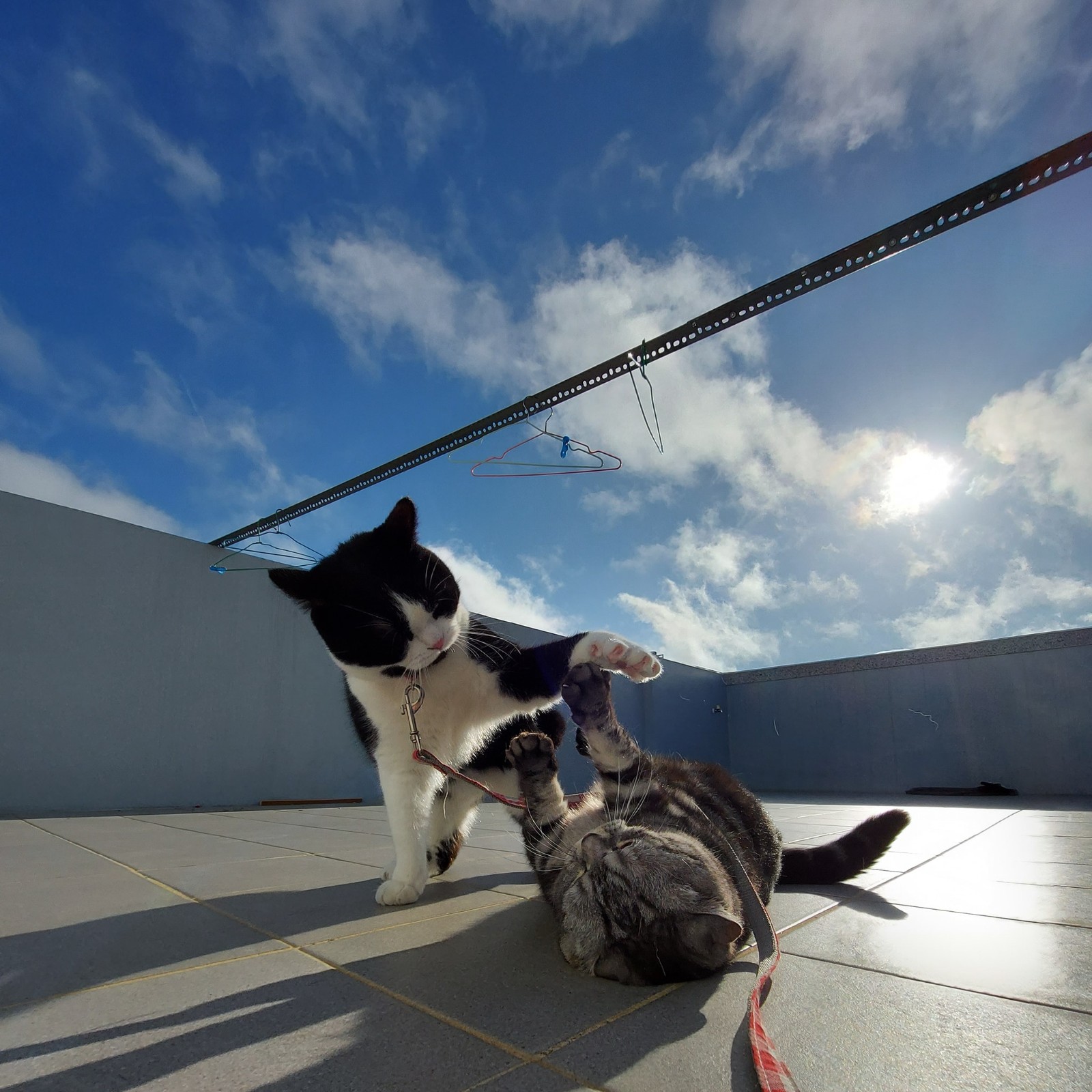 自己的玩具自己曬!飼主張素華家中養了兩隻可愛的貓咪,分別是曼赤肯「寶妹」以及黑白貓「寶迪」,這天馬麻趁著好天氣,將毛孩的玩具拿去洗一洗並曬在陽台上,沒想到寶妹見狀就想要過去搶救自己的寶貝們,還剛好被拍下超有趣的情境照片,現在就一起來看看吧~