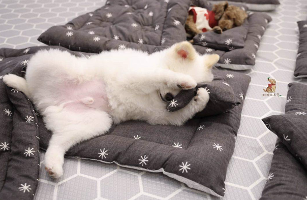 ▼大多數狗狗睡相很好,睡著後也很安穩,但也有幾隻比較叛逆的狗狗,睡著後會把小被子踢飛,甚至頭尾睡反。老師不會強迫牠們以什麼睡姿入睡,只要睡得舒服就好。