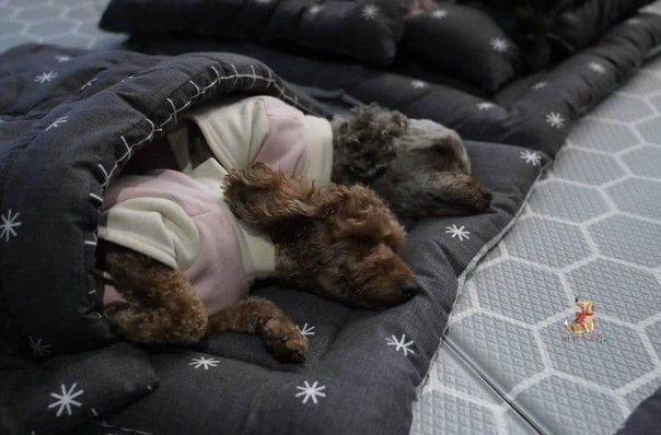 ▼狗狗們也很乖巧,都躺在屬於自己的床鋪上,還蓋上小被子。