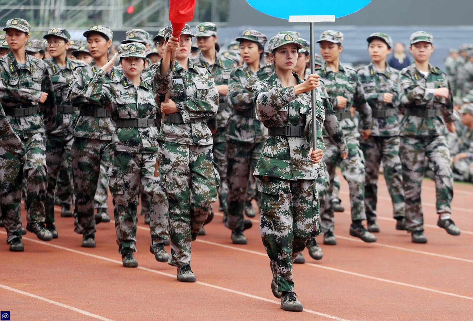 ▼艾菲形象出眾,被選為走在最前方的領旗手。軍訓非常辛苦,她和同學們每天都要苦練6個小時的正步,但也受益頗多。她說:「軍訓是鍛鍊自己的一次機會,所以再累我也會堅持!」