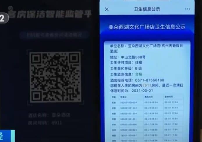 據央視財經報道,浙江杭州下城區衛生監督管理所的一間試點酒店,房間内的用品,包括床單、枕頭套、抹布等,都裝上有如「身份證」的晶片,除了能透過機器一掃上傳清潔和更換紀錄之外,如員工用抹洗手盤的布抹馬桶,裝置亦能感應到,並隨即響起「報警」,把相關信息向酒店預警,並向衛生監督所的留下後台記錄。若酒店的衛生記錄沒有改善,持續出現問題,衛生監督所更會上門監督檢查。而房內亦設有 QR Code,供住客用手機掃描,查閱房內用品的清潔和更換紀錄。