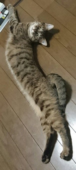 網友們看到後紛紛表示:「建議以後把貓的量詞改為『條』」、「貓:不是我在吹牛,我腿長兩公尺,蠢狗你做不到」、「大概可以從北海道拉到沖繩沒問題的」、「貓:為什麼拉我的腿」、「貓是液態貓,狗是固態狗」。貓咪拉伸後的畫面好療癒啊~