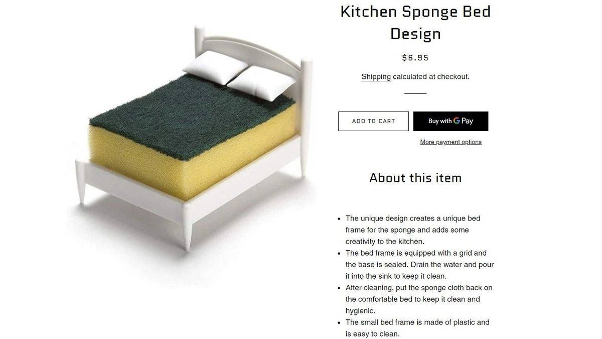 原來老婆購入的是一個海綿百潔布及一個擺放架,設計師巧妙將那擺放架設計成一張雙人床的模樣,更有趣的是還在海綿上擺放了兩個「小枕頭」。雖然整套貨品看起了非常精緻及有創意,但是Aaron卻感到非常荒謬!
