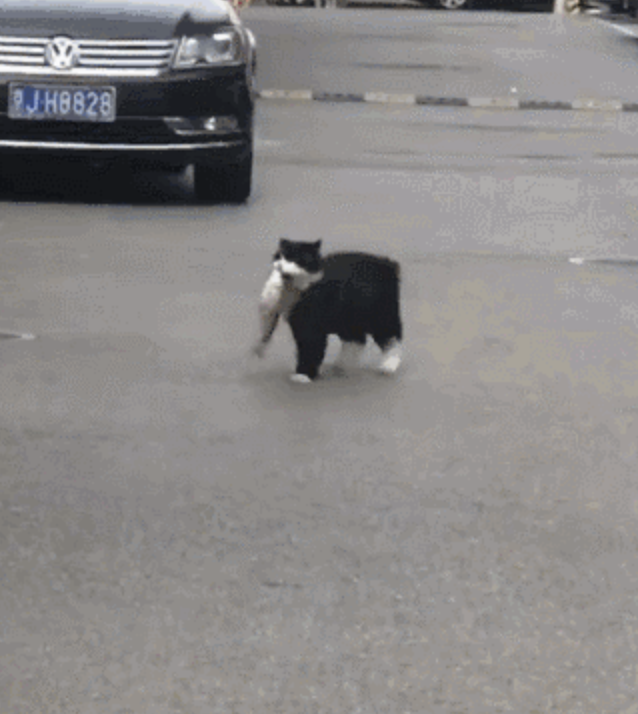 ▼這隻貓咪體型不大,叼著鮮魚走起路來有點吃力。牠努力昂著頭,一路蹦蹦跳跳,看起來傲嬌又可愛。不知道這是從誰家的廚房偷來的鮮魚,看看牠圓潤的體型、柔順的毛髮,肯定不是第一次作案了。