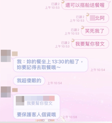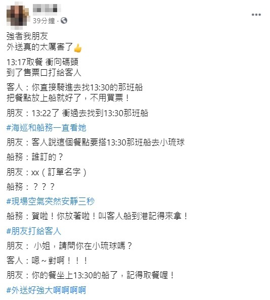 這名外送員到了港口後,馬上打電話告知客人,自己已經抵達,希望對方可以來取餐,孰料對方居然回應:「你直接騎進去找1330的那班船,把餐點放上船就好了,不用買票!」讓她半信半疑地想要騎進去,結果卻被擋住,她只好一五一十地回答,讓海巡聽了也愣住,最後才說:「賀你放著啦,叫客人船到港,記得來拿!」