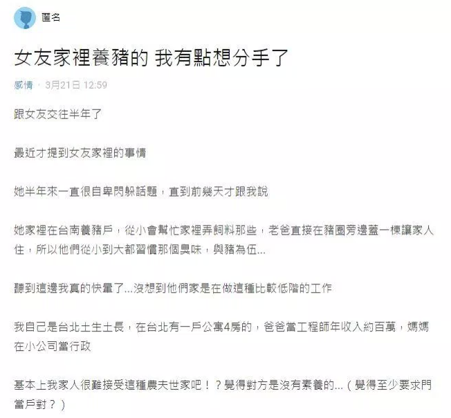 2021年03月25日因為女友家人的工作提分手?日前一名男網友在Dcard貼文,表示:「女友家裡養豬的,我有點想分手了。」原po說,他跟女友交往半年,才知道對方家中是養豬戶,「沒想到他們家是在做這種比較低階的工作」。他求助網友:「對於這段沒有結果的戀情要不要早點分手了呢?」