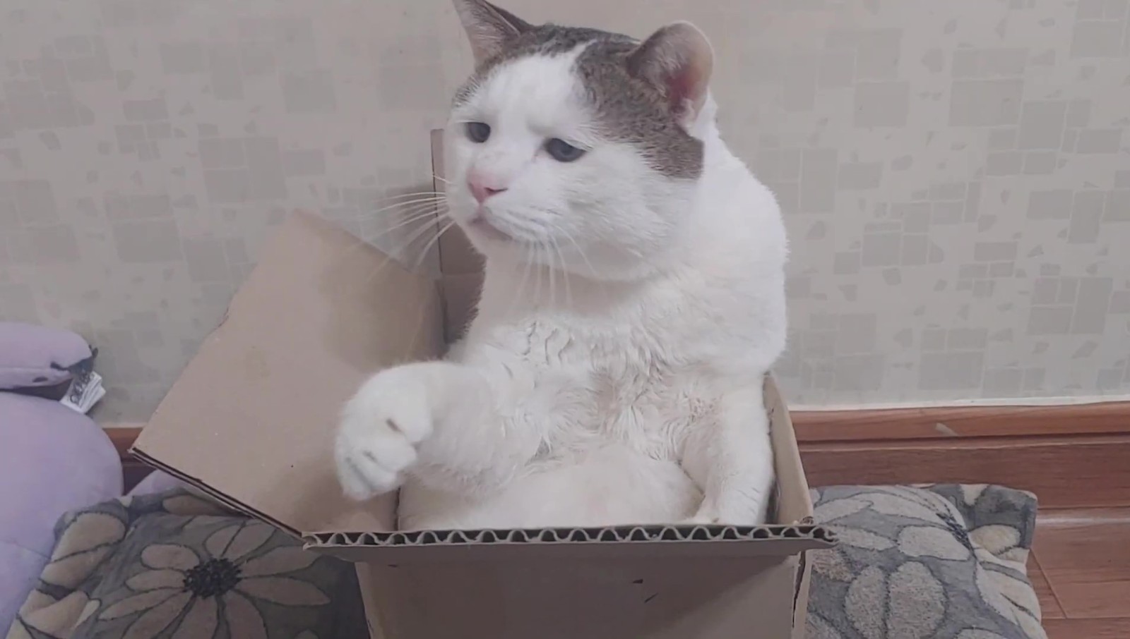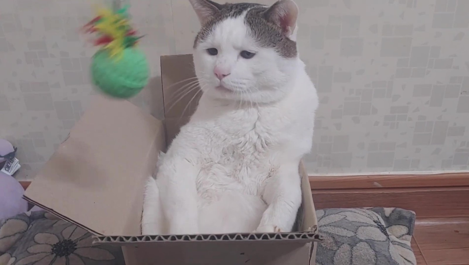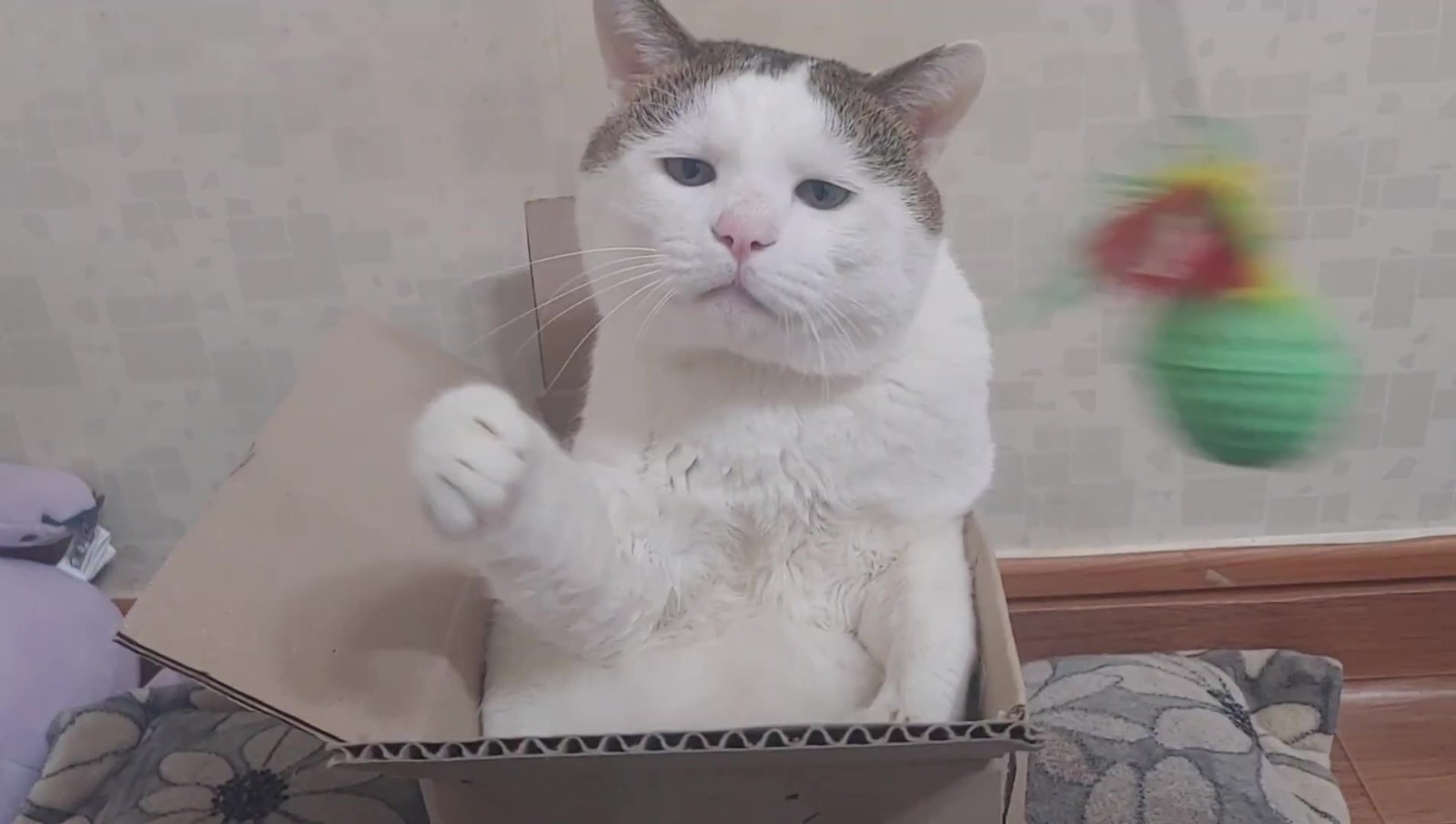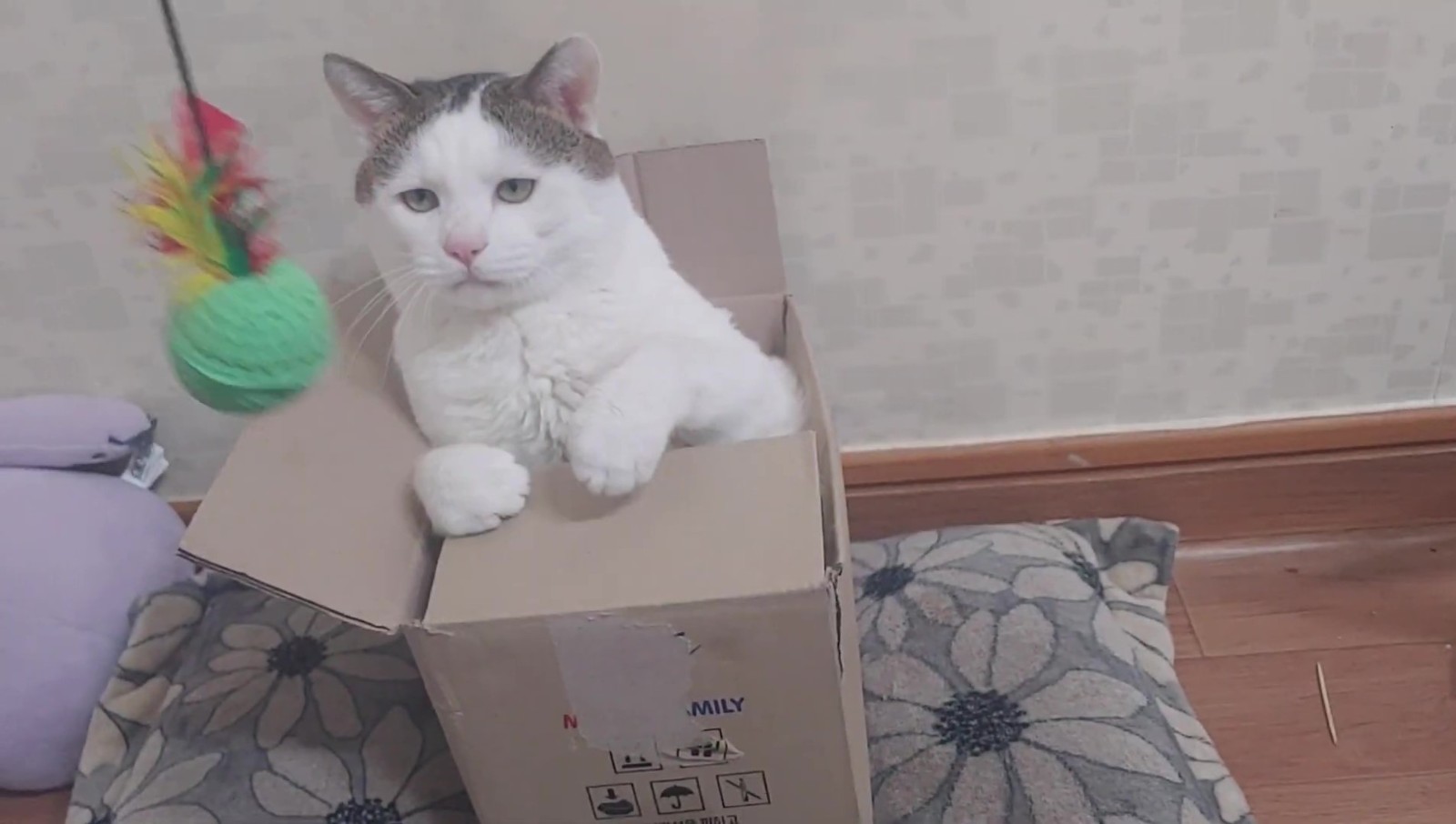 這隻貓咪其實名叫억울이(Urgry),因為天生的哀怨臉和讓人想偷捏的豐厚嘴邊肉而吸引了不少粉絲關注~這天只見牠半窩半坐在一個小紙箱內,瞇瞇眼看起來有些無神,於是飼主便拿出了逗貓棒想逗逗牠,好在這孩子一看到逗貓棒還是有反應的,牠緩緩地伸出了手手...