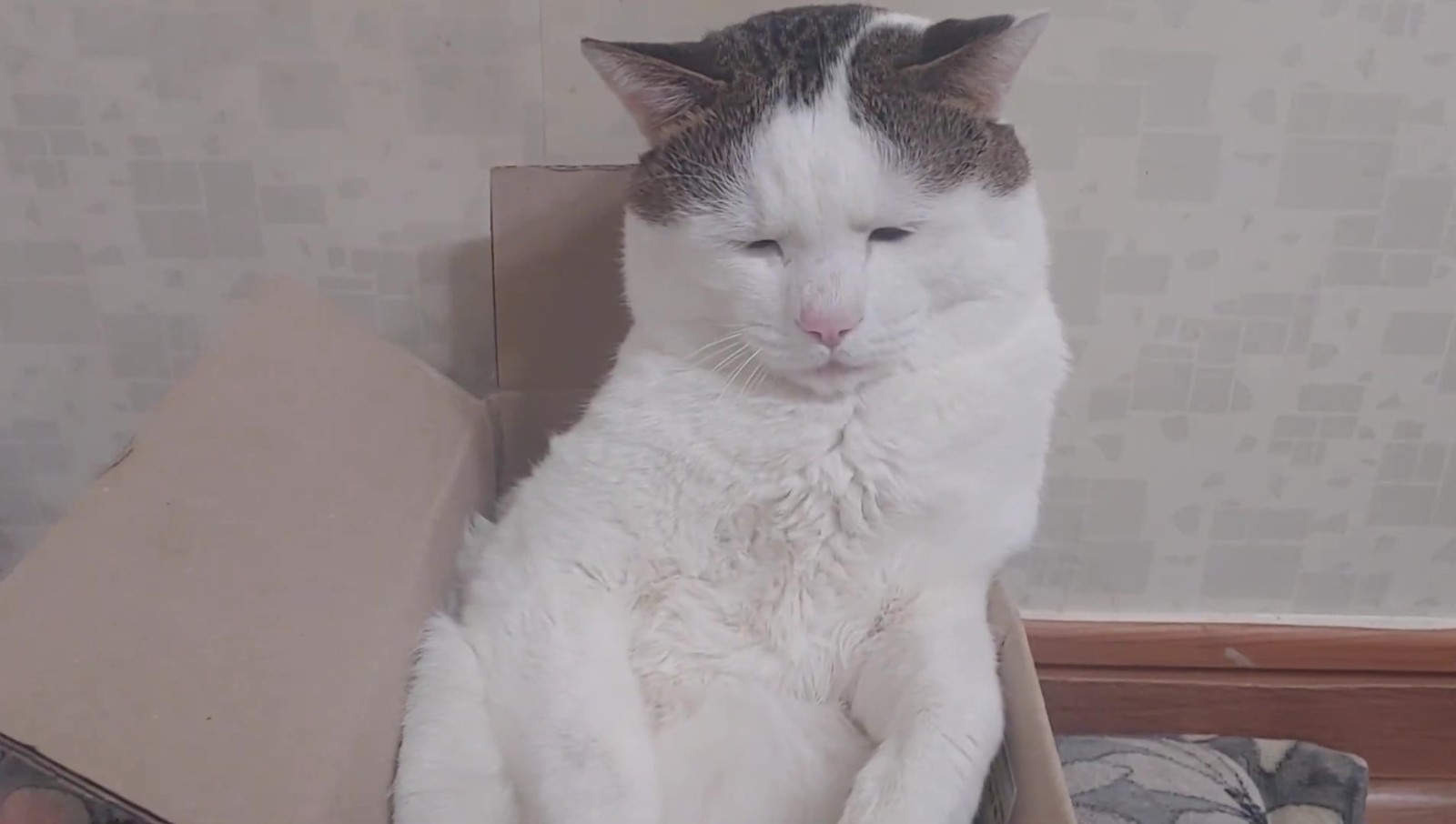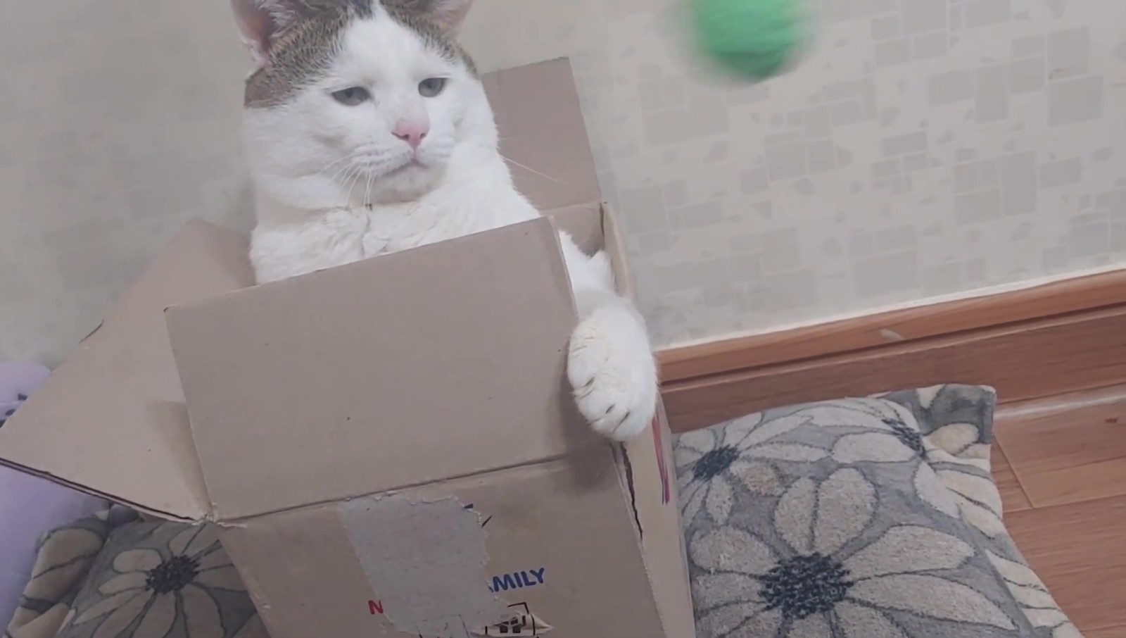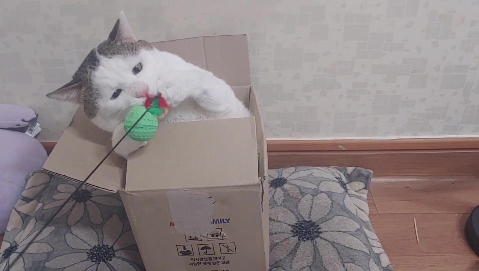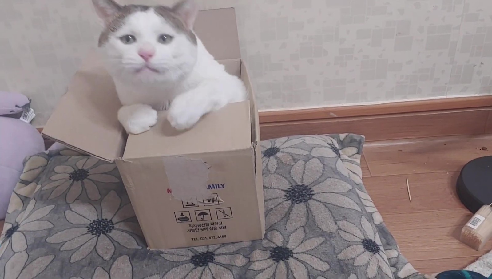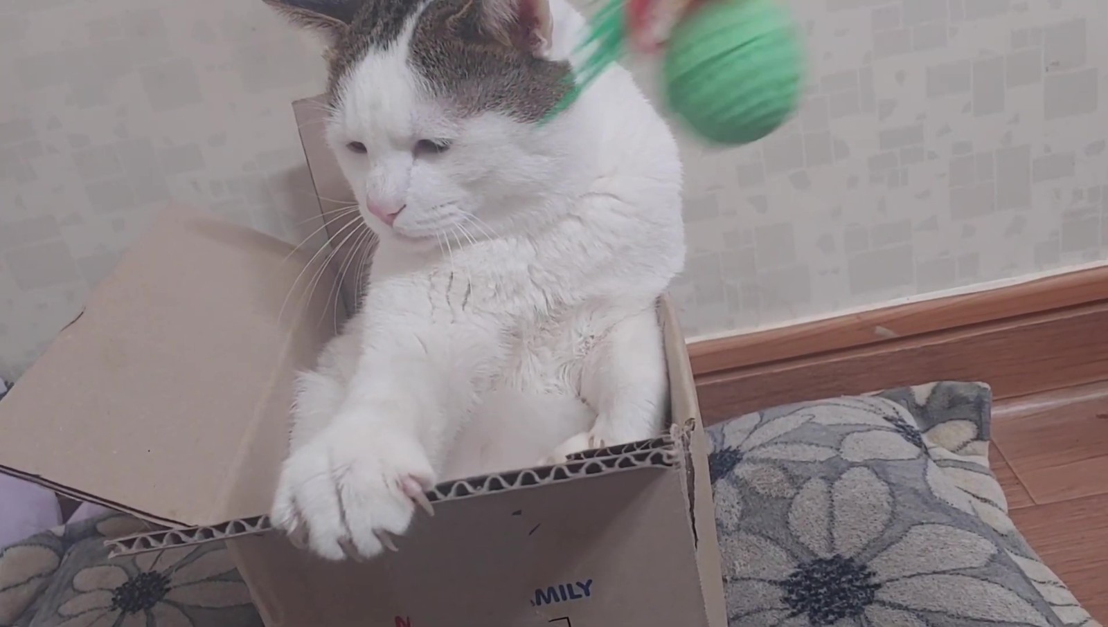 這隻貓咪其實名叫억울이(Urgry),因為天生的哀怨臉和讓人想偷捏的豐厚嘴邊肉而吸引了不少粉絲關注~這天只見牠半窩半坐在一個小紙箱內,瞇瞇眼看起來有些無神,於是飼主便拿出了逗貓棒想逗逗牠,好在這孩子一看到逗貓棒還是有反應的,牠緩緩地伸出了手手...
