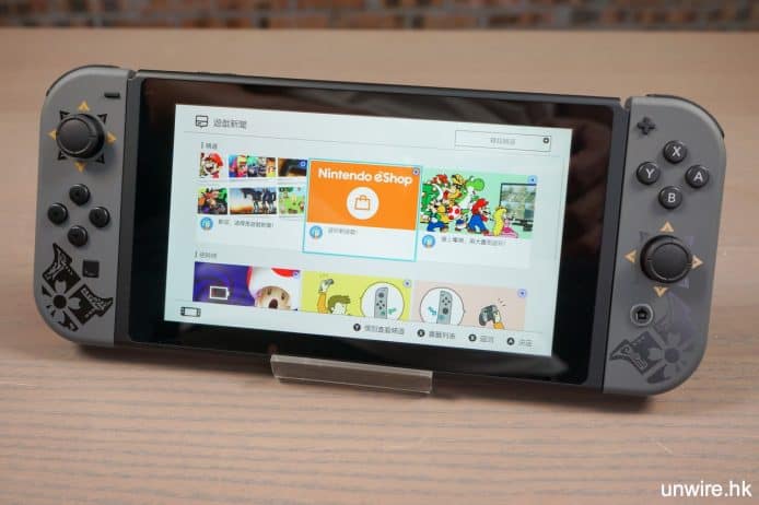 ▲主機外今次最特別設計就是Dock底座,印有主要魔物「怨虎龍」的圖案,還有遊戲名字MONSTER HUNTER RISE