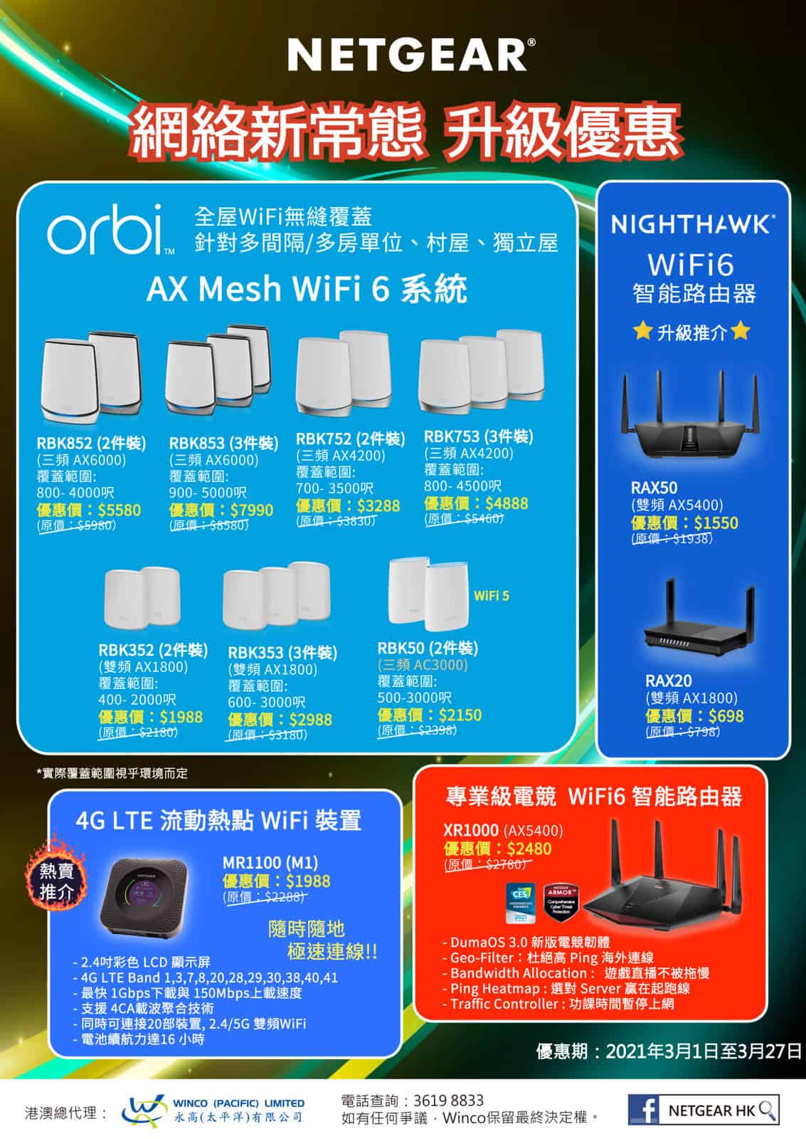 相信仍然有不少公司會安排員工 Work from Home,亦有不少學校未完成恢復面授課,因此家中對網絡連線的需求亦相當大。近日 NETGEAR 推出全新優惠,對於需要提升家中網絡連線能力的朋友絕對是一大福音。而其中多款產品亦有提供優惠價,包括 Orbi Mesh WiFi 系列、Nighthawk 系列及 Pro gaming 系列等,相信定能滿足不同需要的朋友。而今次優惠期至 3 月 27 日,有興趣的朋友要把握機會了。