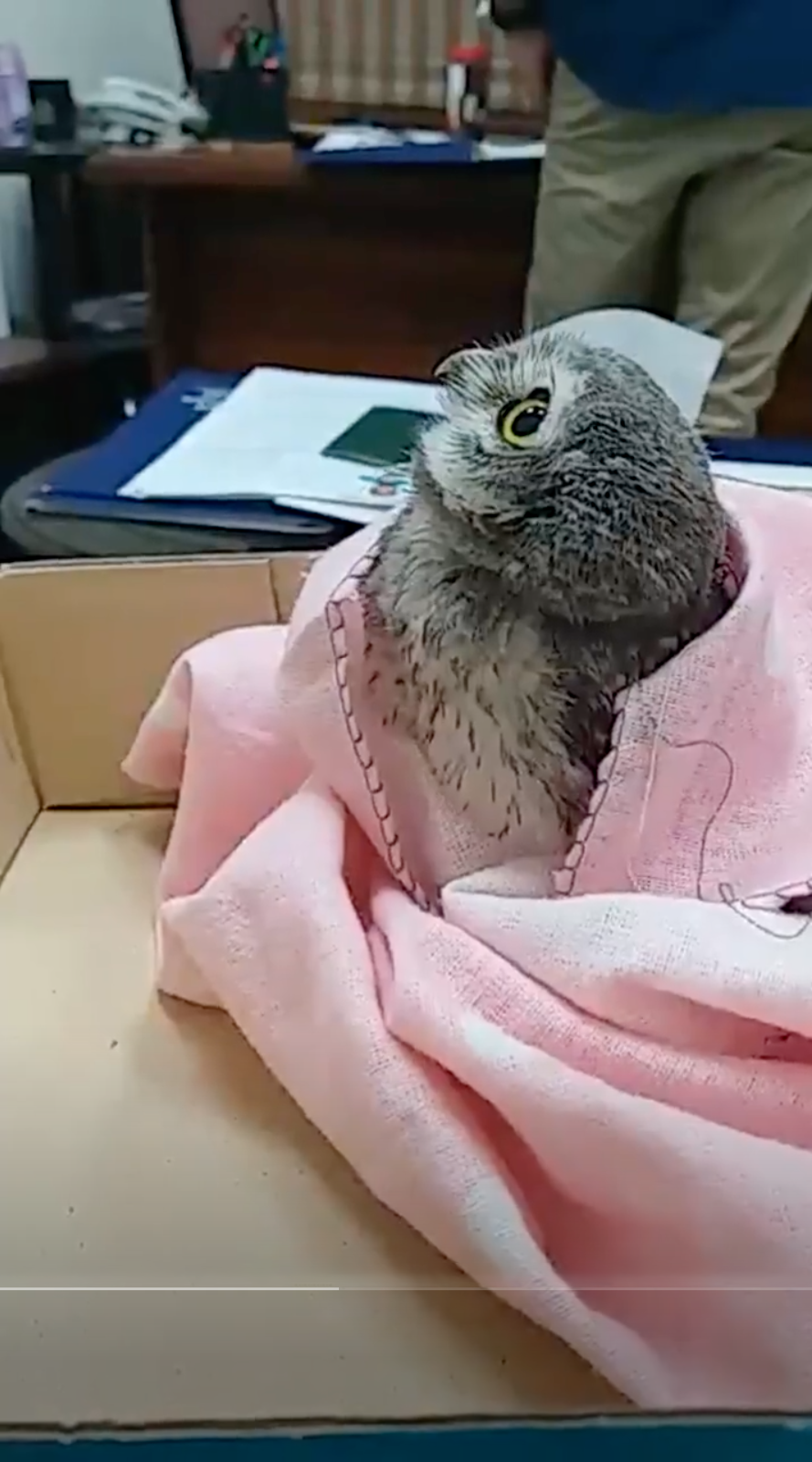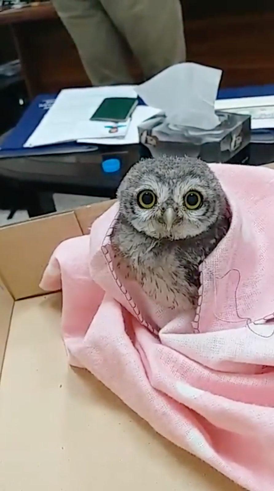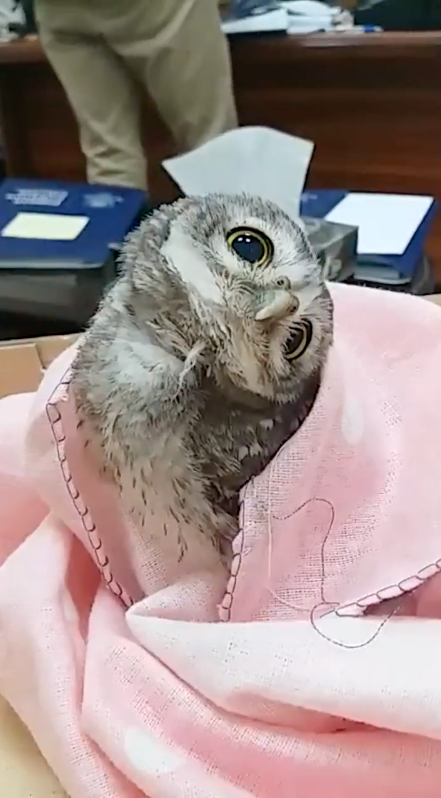 ▼Khalil在校園裡散步時看到過貓頭鷹,但從沒有這樣近距離接觸過。原來一場雷雨過後,這隻貓頭鷹寶寶從鳥巢裡掉了下來,牠全身的羽毛都濕透了,看起來很可憐。Khalil的同事將牠帶到辦公室照顧,當時辦公室裡冷氣很足,他們還找來一塊柔軟的布將貓頭鷹寶寶包起來,防止牠著涼。