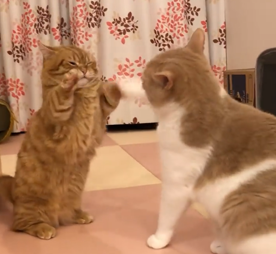 某天兩隻貓咪並肩走在一起,但Chomi不知道哪根筋不對突然看妹妹不順眼,竟然一邊走路一邊伸手巴牠的頭,不甘示弱的Putico當然也有站起來反擊,只是礙於手比較短根本不是姊姊的對手,當下根本只能被「壓著打」,隔著螢幕都可以感受到牠手腳短短的無奈與憂傷!