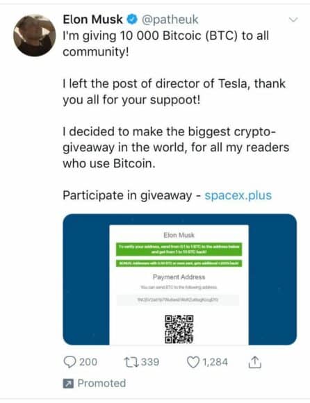 據英國廣播公司 BBC 報導,德國一名男子在 Twitter 上被騙走 10 枚比特幣,事源在 Tesla 行政總裁馬斯克 Elon Musk 的推文下,附上了 Tesla 正進行比特幣雙倍回贈的連結,由於網站的設計相當專業,以假亂真, 男子不虞有詐,最終慘失40.7萬英鎊,約438.64萬港元。