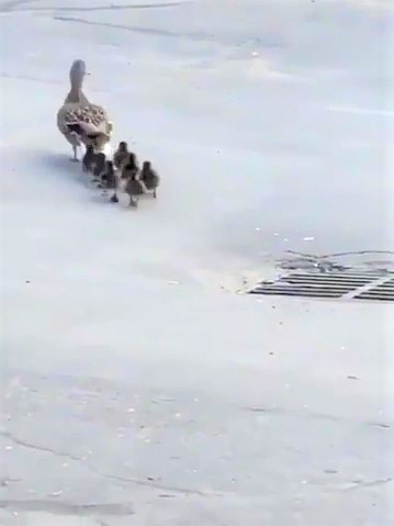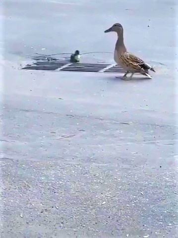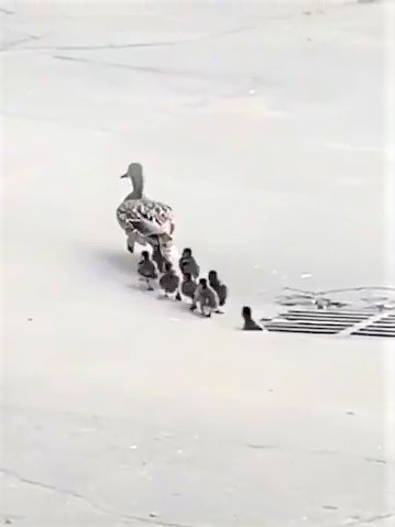 都說母子連心,鴨媽媽往前走了幾步也感應到少了隻孩子,連忙回過頭要尋找,哪知後頭的孩子們也跟著走、還又一股腦地往水溝蓋跑,結果就這樣一隻接一隻掉進水溝蓋中,鴨媽媽又一個回頭,只看到剩下水溝蓋旁的一隻小鴨鴨了...(登愣)