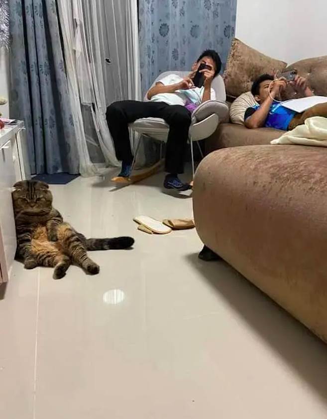 ▼這天家裡的2個男人正在玩手機。他們一個半躺在椅子上,另一個躺在沙發上,一副頹廢、懶散的模樣。坐在不遠處的貓咪也懶洋洋的,只見牠半坐在地板上,身體靠著櫃子。如果再給牠一部手機,應該就跟另外兩個人一樣了吧。