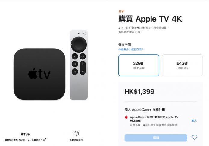 新款 Apple TV 4K 提供兩款分別為 32GB 的存儲空間售 $179 美元(香港售 HKD $1,399),64GB 型號則售 $199 美元(香港售 HKD $1,599),並將於 4 月 30 日問始接受預訂。