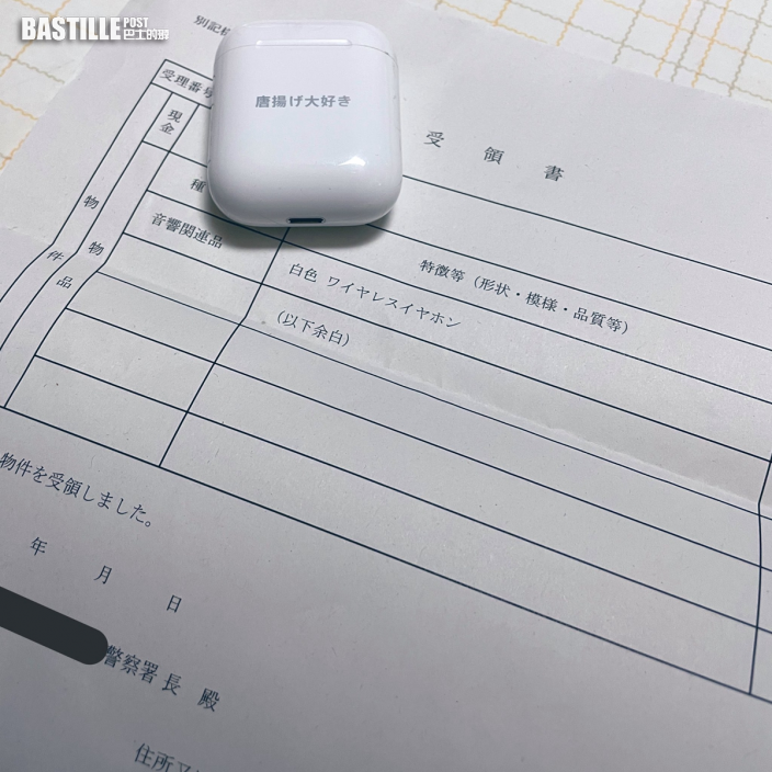 為此咲羅於是告知警方,他的AirPods充電盒正面印有「超愛炸雞(唐揚げ大好き)」的字樣,背面亦貼上熊貓圖案的螢光貼紙,由於裝飾風格實在太特別,咲羅終順利取回自己的耳機。