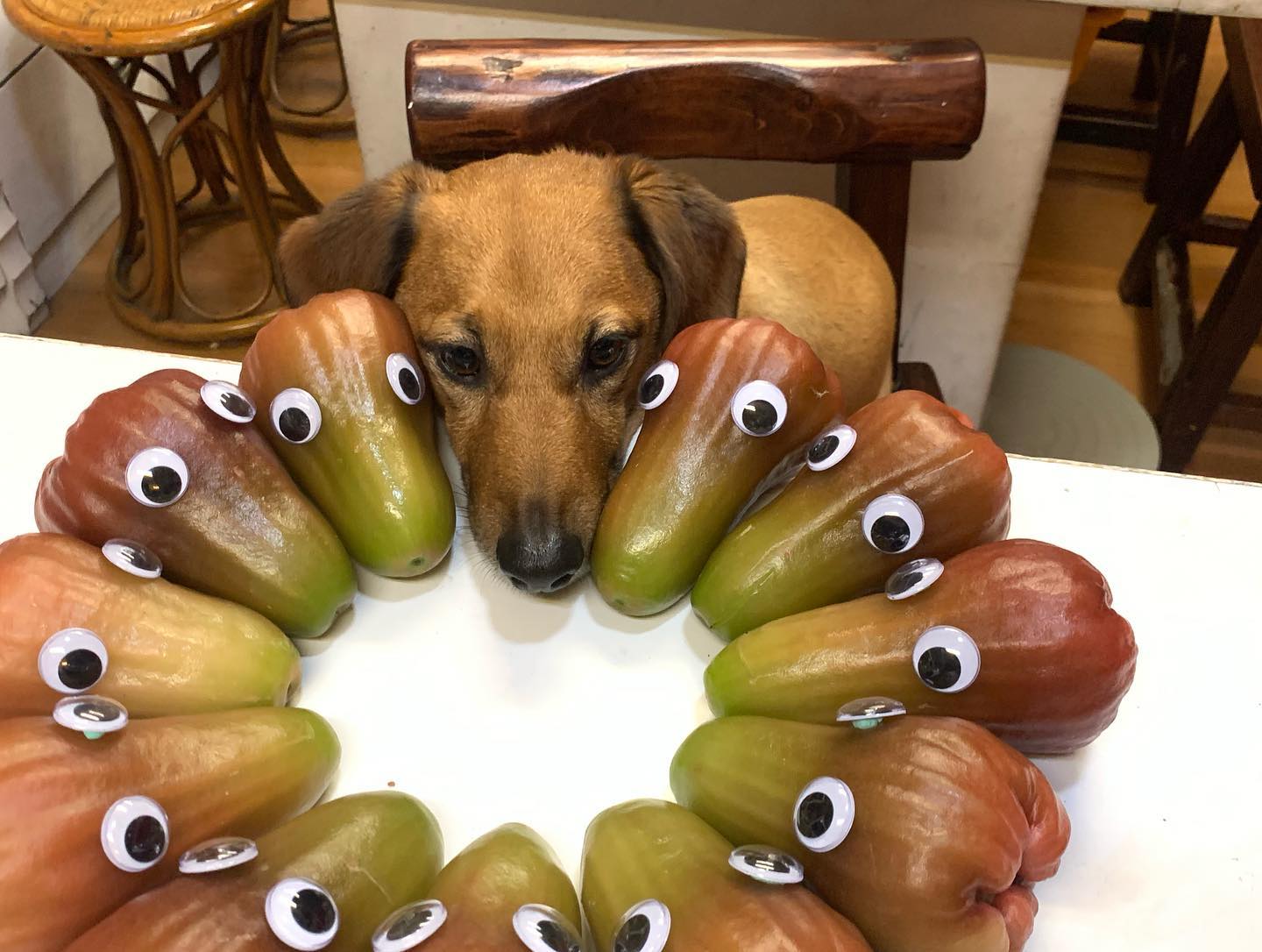 飼主表示,當時自己剛好收到友人贈送的水果,拿起來發現這個蓮霧的品種形狀跟愛犬東古的頭有點像,剛好當時東古又把頭饋在桌子上,才興起了動手拍創意照的念頭。