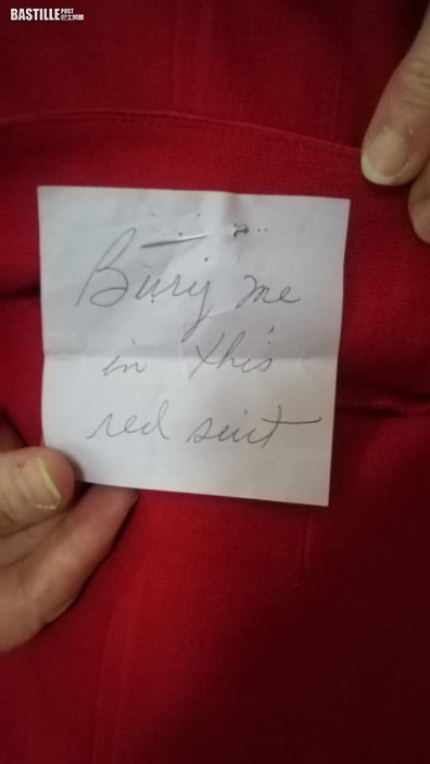 好奇的JoAnn於是將紙條拿出來查看,她原本以為是商家留下的,沒想到打開後卻發現上面寫著「讓我穿著這件紅色外套下葬」,疑似是衣物前主人留下的。JoAnn與店員討論後推測紙條應該是前主人過世前寫下的,希望家屬在她離世後為她穿上這件外套入土為安。不料家人卻沒有發現這張紙條,甚至還將外套二手出售了。