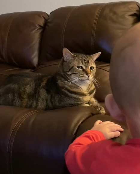 小寶寶似乎對家裡的虎斑貓感到非常好奇,這天看到貓咪趴在沙發上休息,伸手就想摸人家的頭,沒想到真心換絕情,貓主子不但完全不給摸,還露出一臉無奈又鄙視的表情,最後還意味深長地看向鏡頭似乎是在說:「奴才你還拍啊?還不快點把你小孩帶走!」
