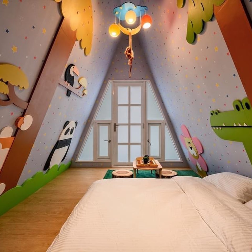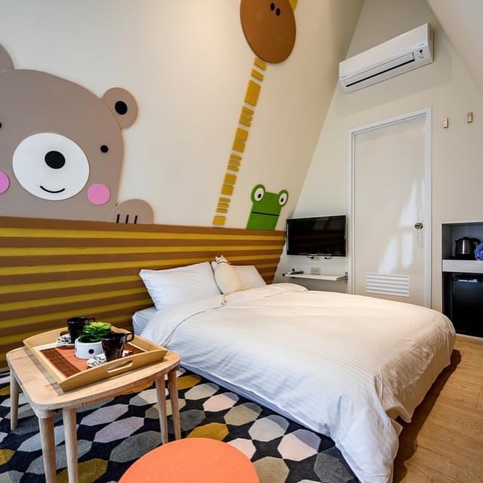 房間裡面也超萌超療癒的!!童趣又可愛的牆壁裝飾和繽紛吊燈都讓小孩興奮到不行,仔細看還可以看到燈上吊著小猴子呢~