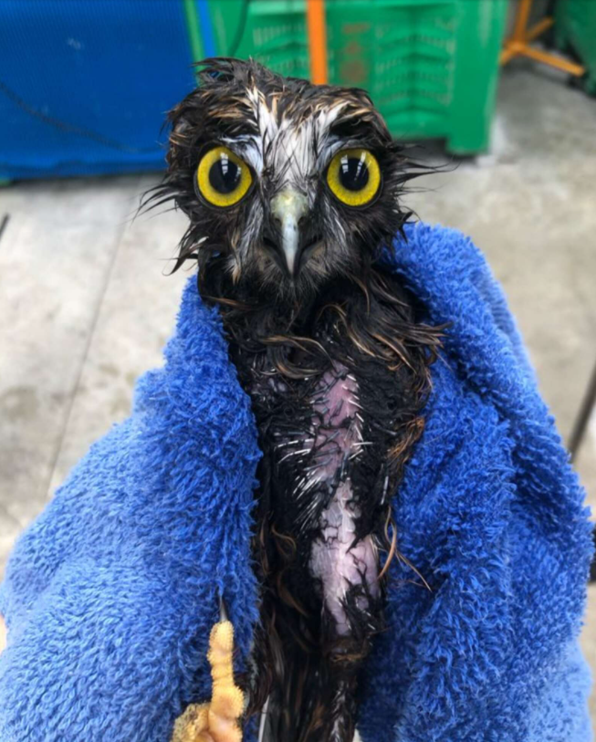 讓人家「溼身」、形象都沒了最近紐西蘭一家動物醫院Massey Wildbase animal hospital收治了一隻救援的小貓頭鷹,牠身上有些皮膚感染的狀況,要是沒有接受治療的話將會影響到牠的健康,好在這算是相對容易解決的狀況,就是得先替小貓頭鷹洗個澡、身體乾淨後才好進行後續治療,不過這小傢伙卻不樂意了,因為牠下水後讓所有人都忍不住笑了XD