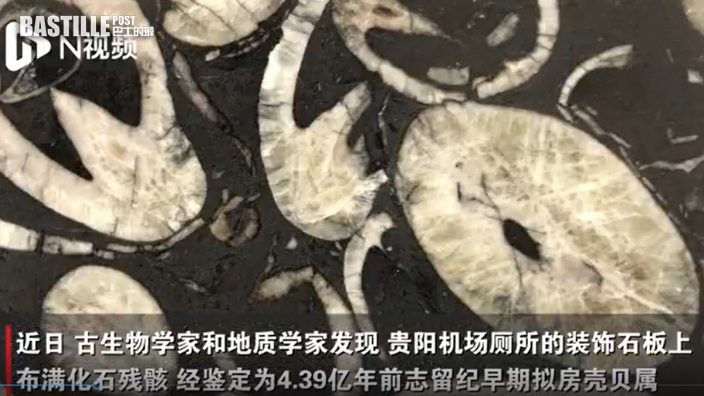 據內地媒體報導,中國礦業大學地質系主任陳尚斌日前出差,在貴陽機場的廁所內發現一個用大理石製成的洗手台十分特別,他仔細觀察後認為是化石殘骸,於是拍下照片分享到網上。之後,地層古生物專家錢邁平博士、中國科學院沈樹忠院士見到大理石後,通過交流、鑑定,認為這些化石是來自約4.39億年前志留紀早期的五房貝屬。