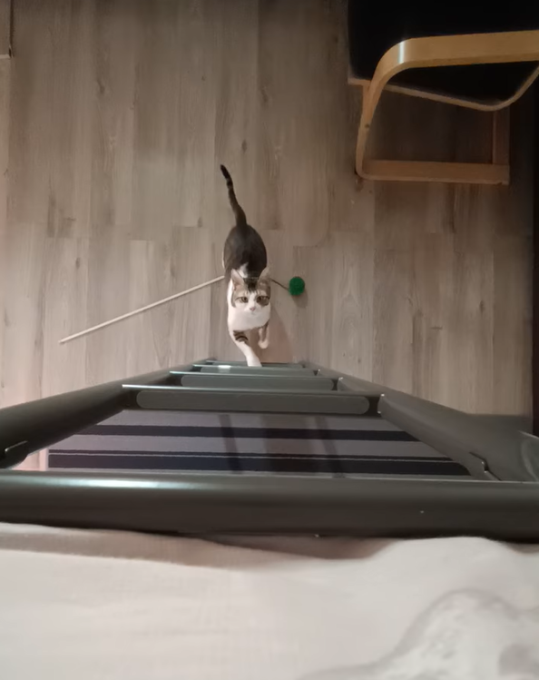 這天早上6點天都還沒亮,貓哥哥摩卡就將逗貓幫叼在嘴裡,徒手沿著床架的樓梯爬上來要馬麻陪玩,而逗貓幫敲到樓梯的聲音很快就將范范吵醒,探頭一看就看到一團黑黑的身影慢慢往上爬,讓她嚇了好大一跳並無奈發文表示:「這一爬看下去挺嚇人的,是我電影看太多嗎?」