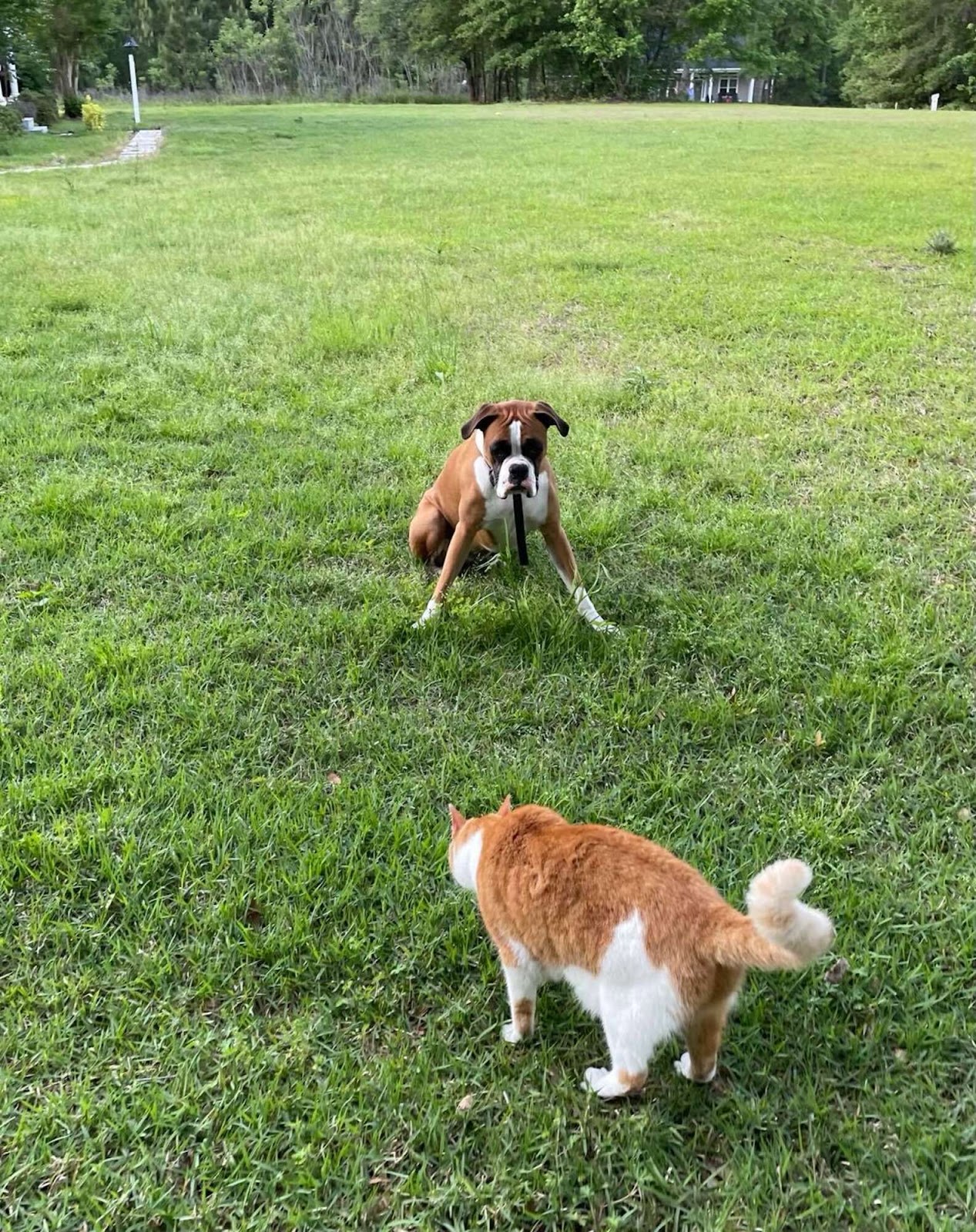 ▼媽媽在院子裡設置隱形圍欄,來保護毛孩子們。Charlie很快就找到了躲避隱形圍欄的方法,但Harley不知道。