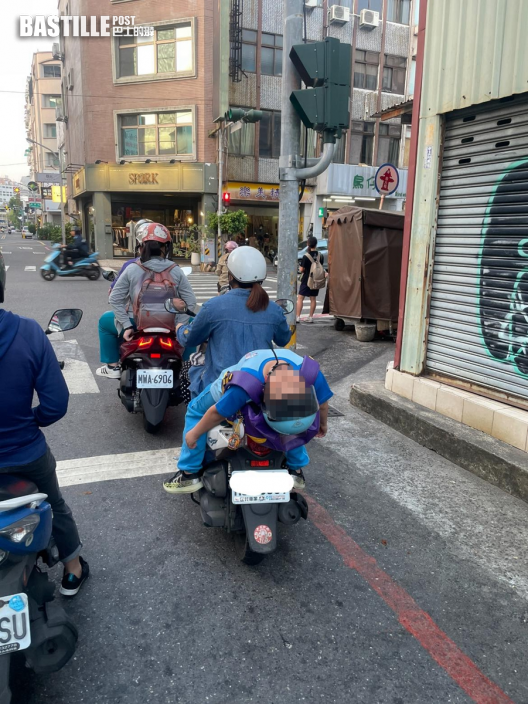 這名網民4月23日在Facebook群組「路上觀察學院」發文,指自己當日騎電單車上班途中,等紅綠燈時看到旁邊一位婦人載著一名身穿小學體育服及背著書包的男童,而男童則在後座倦極而睡。