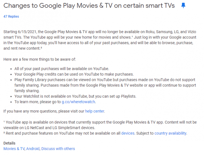 Google is shutting down the Google Play Movies & TV apps for Roku, Samsung, LG, and Vizio smart TVs on June 15, but past purchases should be available in the YouTube apps for those platforms, and you can use Play credits with YouTube. Watchlists won't transfer though.pic.twitter.com/WJh0qAYTPg