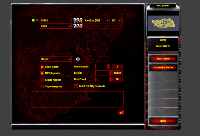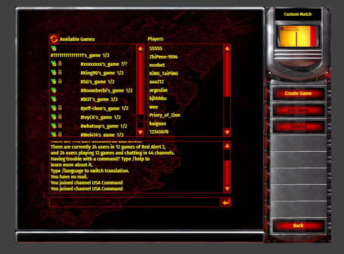 隨後會進入到全球伺服器,右側就會顯示目前可以加入的房間 “Available Games”。找沒有鎖頭不需密碼就可以進入遊玩,也可點擊右側的 “Create Game” 建立遊戲房間。設置和以前一樣,可以調整 Game Speed、Credits、Unit Count 數量等等。