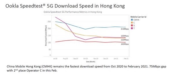 香港 5G 服務推出接近一年,也差不多是時候整理過去的數據,看看哪個網絡表現最好。2021 年年初,CMHK 被 Speedtest 評為「香港 2020 年度第四季最快速 5G 網絡」。最近, Speedtest 再度發表最新「香港 5G 網絡表現報告」,CMHK 再下一城,從去年 12 月至今年 2 月之間連續 3 個月,速度都領先本地其他對手,其中 2 月平均下載及上載速度分別達 210Mbps 及 32Mbps,表現亮眼。