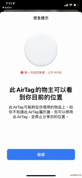 記者A 手持 AirTag 第一日,一整天未有收到任何通知,直至第二日晚上 7 時許,iPhone 始收到「尋找」App 的通知,提示「發現 AirTag 正隨著你一起移動」。