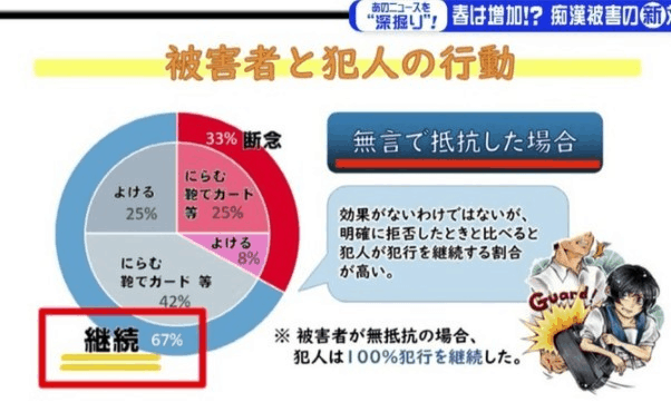根據日本警方統計,受害者面對電車內的痴漢行為如果不發聲反抗的話,有67%的比例仍然會繼續其侵害的行為,但如果有第三者發聲或者以行動阻止,100% 的「痴漢行為」都會停止。
