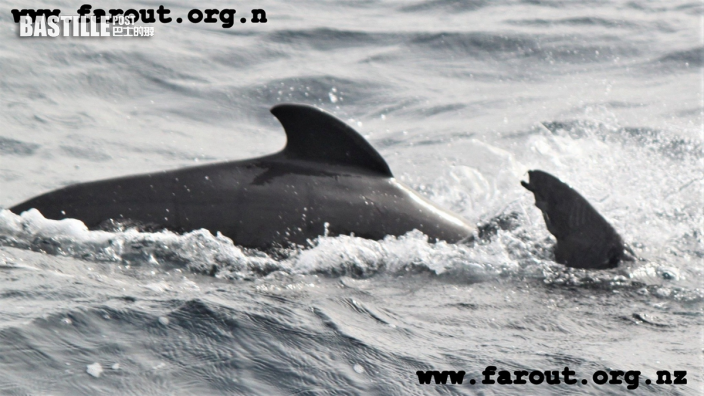 據外媒Stuff報道,紐西蘭遠洋研究中心(Far Out Ocean Research Collective)日前在其官方專頁發文,表示由今年初便在島嶼灣(Bay of Islands)的外海發現到這條樽鼻海豚媽媽正在撫養一條領航鯨BB。研究人員Jochen Zaeschmar表示,過去已知樽鼻海豚會收養和照顧其他物種的寶寶,但大多都是體形相近,「照顧比牠們大的物種是非常罕見」。
