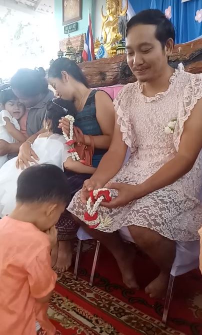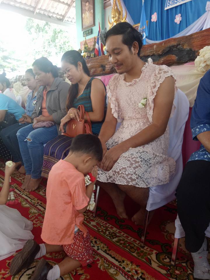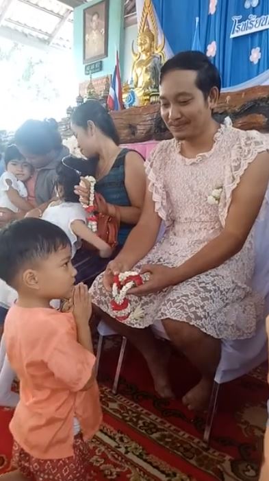 2021年05月07日每年的8月12日是泰國的法定母親節,這一天泰國的各大學校和機關都會放假,放假前還會舉辦活動,讓孩子以跪拜的方式感恩母親。不過對於那些由單親爸爸照顧長大的小孩,這樣的活動不免會讓他們感覺失落。下面這位單親爸爸不希望孩子在活動上落單,於是穿上女裝陪伴孩子參加母親節活動。