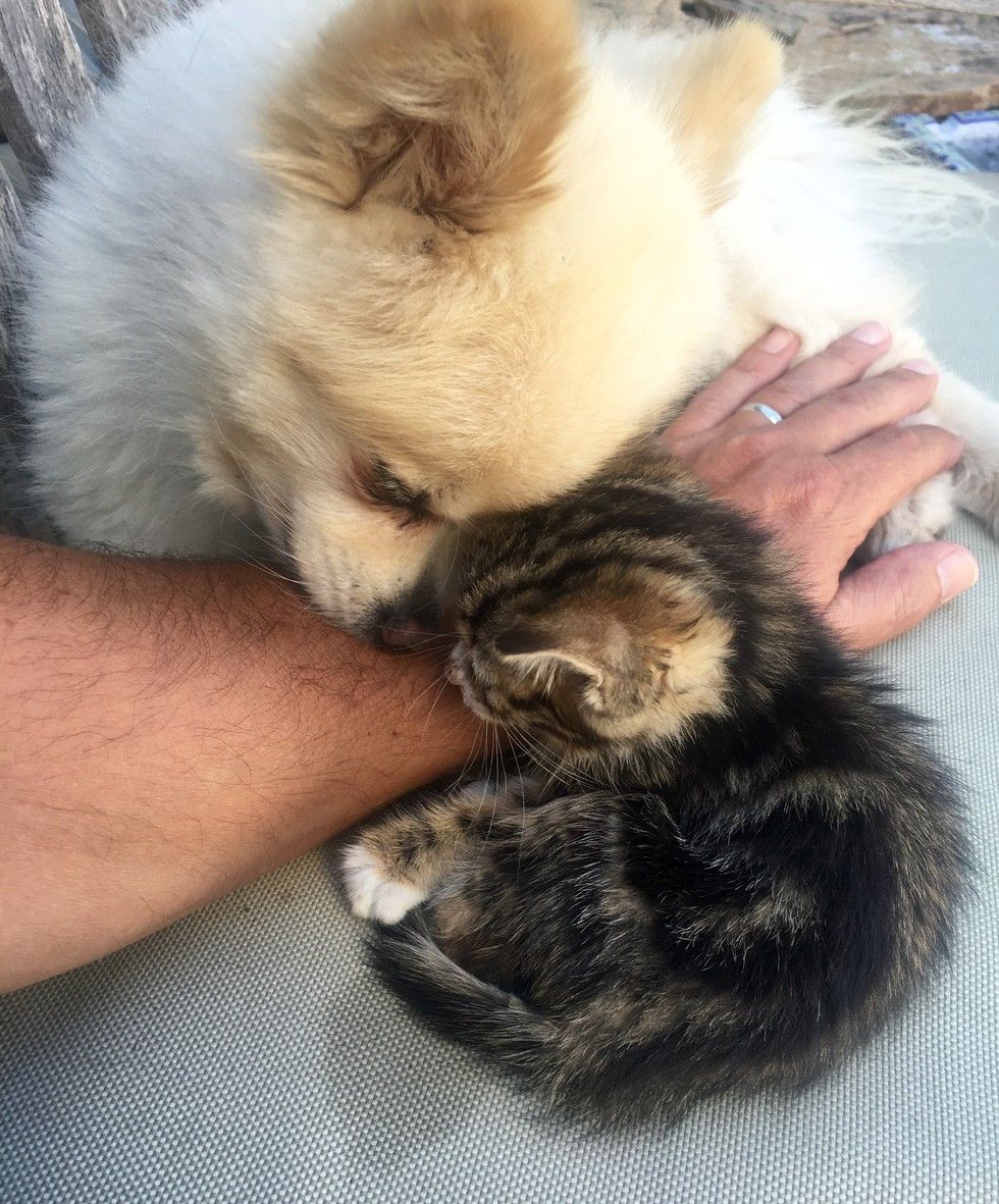▼Sharra家中有2隻狗狗,除了Roxy,還有一隻11歲的博美犬,牠也很喜歡這隻可愛的小貓。