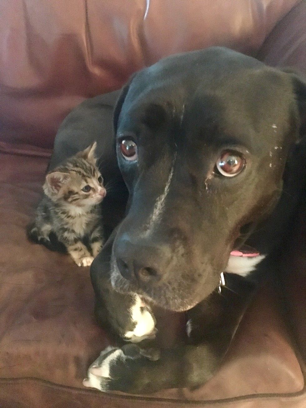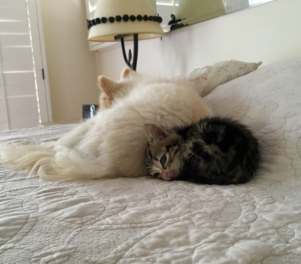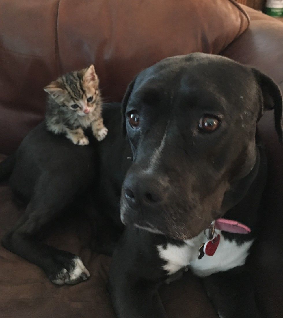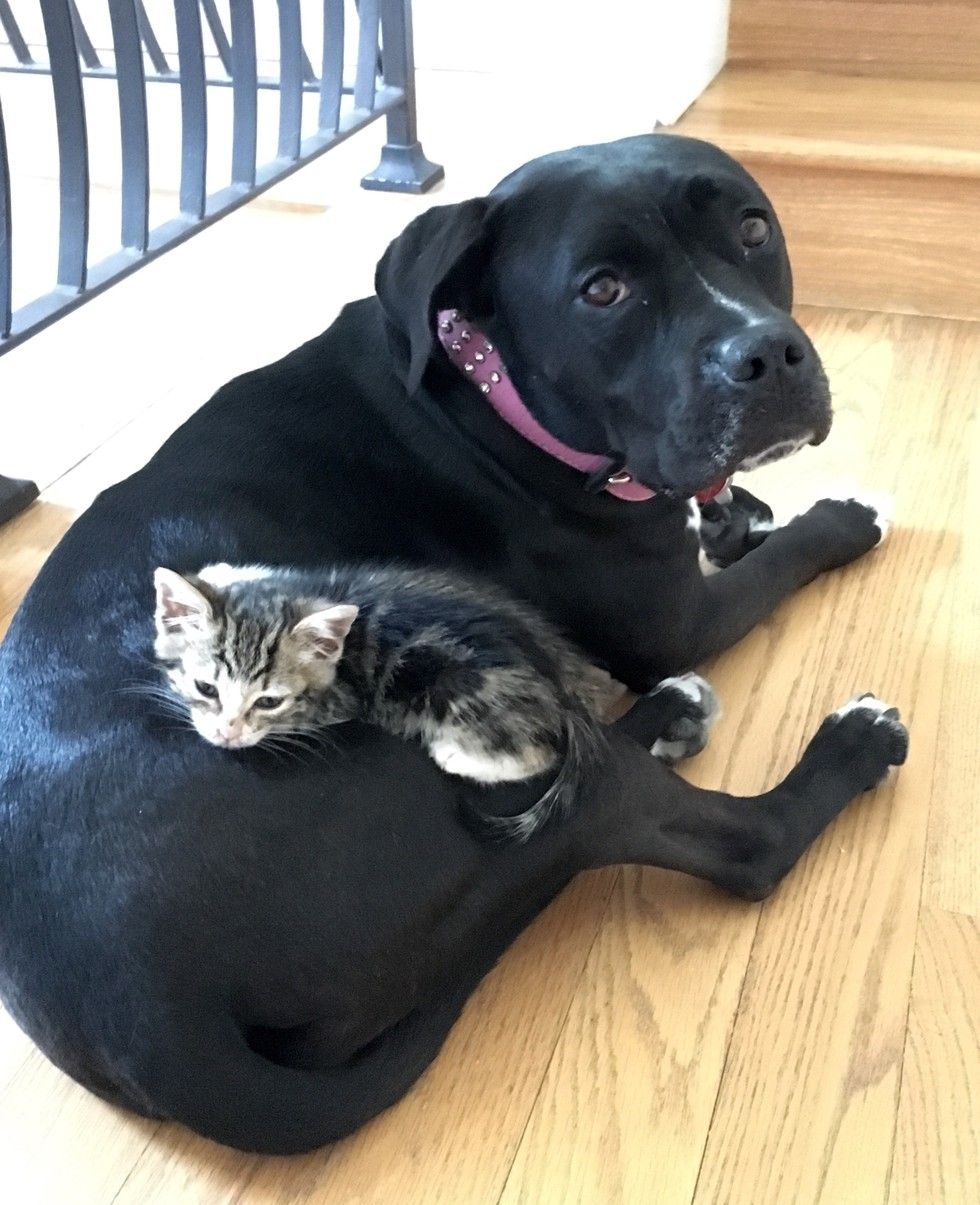 ▼Roxy似乎把自己當成了小貓的媽媽,小貓也非常黏牠,把牠當成自己的依靠。Sharra鬆了一口氣,她決定把小貓留下來,並給牠取名為Crenshaw。