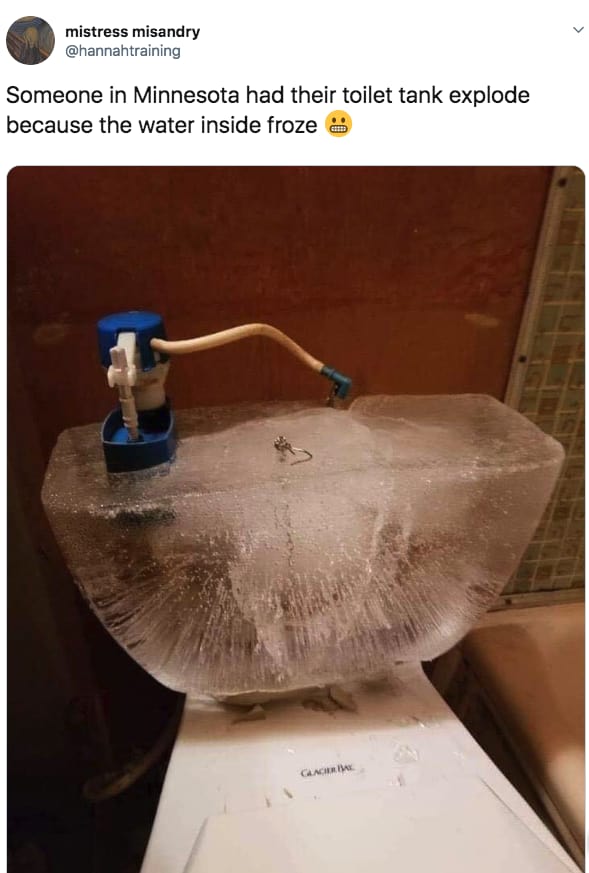 還有某個網友因為家中馬桶水箱裡的水結冰膨脹,最後導致整個水箱被撐到炸掉的案例!(太可怕了吧)