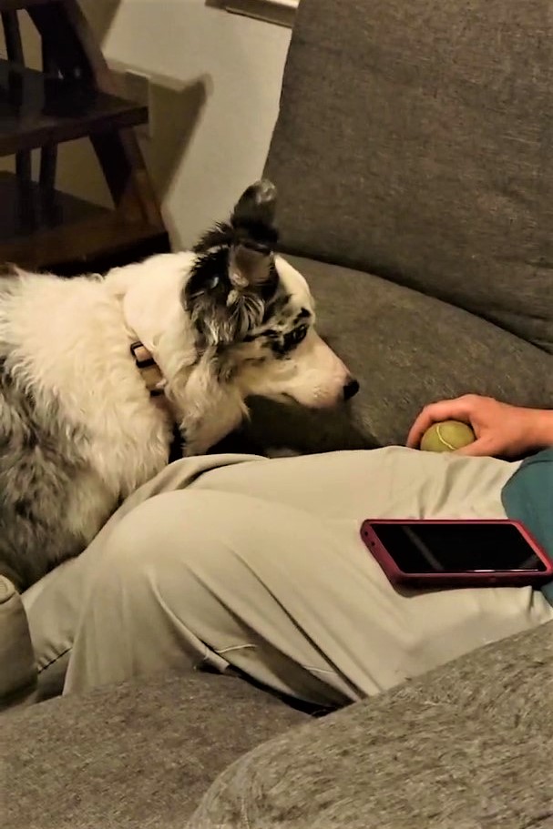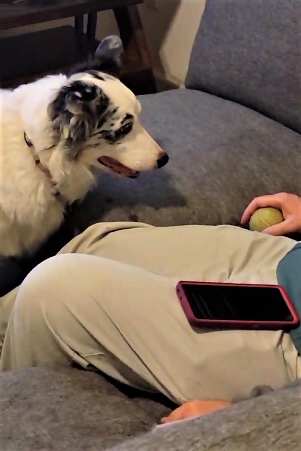 美國加州克洛維斯(Clovis)一戶人家家裡養了隻澳洲牧羊犬,這天老先生大概是看電視看到一半就在沙發上睡著了,只見他右手還握著一顆球,似乎本來是準備要和一旁的狗狗玩的...「爺爺我們不是說好要玩球球的嗎?」
