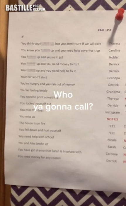 日前,有國外爸爸在Tiktok平台上拍片分享妻子在外出旅遊前為女兒準備的聯絡人清單,有趣的內容吸引超過280萬次收看,和超過30萬的點讚。原來這位媽媽為因疫情需留在家中上網課的女兒貼心準備了發生意外時可聯絡的親友名單和電話號碼,內容卻相當爆笑。