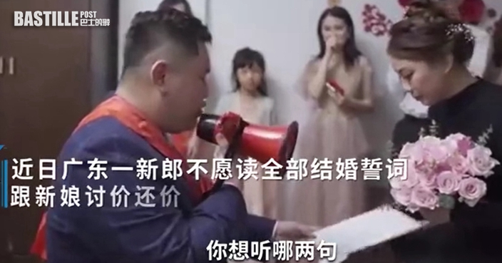 近日,內地廣東一段娶親的影片在網上流傳,當中一名新郎迎娶新娘時一開始還配合歡樂氣氛單膝下跪,但當看到新娘和伴娘事先擬好的誓詞內容時即有微詞,稱只能讀出部分,並討價還價要新娘「選兩句」,新娘則回應「我想你讀完整段」。新郎聽到臉色即變,搖頭指「我沒能力實現」之後又佯裝起身稱「我走了,拜拜!」