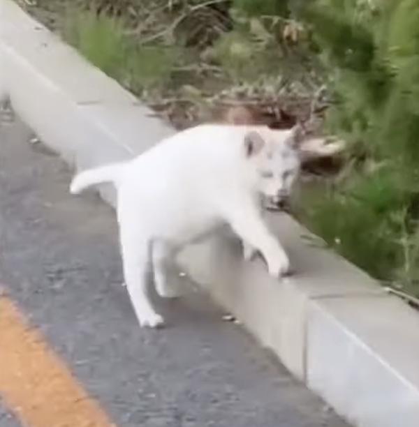 ▼這一幕發生在遼寧大連市,一名趙小姐走在路上時看到了這隻奇怪的白貓。牠走路的姿勢很不尋常,並不是四腳著地快速奔走,而是用前爪扶著路邊的石階,用後腳著地。牠一步一步拖著沉重的步伐緩慢前進,就像一個走不穩的醉漢。