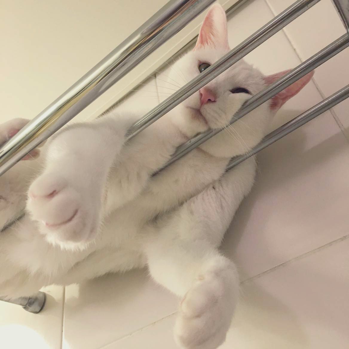 原來這條毛巾就是推主家裡的貓咪偽裝的!剛好這孩子擁有一身白毛,只見牠趴在毛巾置物架上、偽裝成「間諜毛巾」,軟軟的肚肚就這樣從縫隙中溢出www
