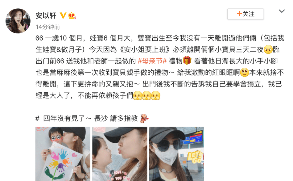 近日,「倆孩辣媽」安以軒久違更新社交動態,配文寫道:「66一歲10個月,娃寶6個月大,雙胞出生至今我沒有一天離開過他們,包括生娃寶坐月子,但今天因為《安小姐要上班》必須離開小寶貝三天兩夜。」