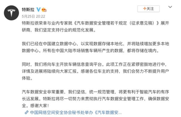 Tesla 在 5 月 25 日透過微博發佈公告,指自己已在中國建立數據中心,所有在中國銷售車輛的數據都會儲存在中國,並表示未來會向車主開放車輛信息查詢平台。